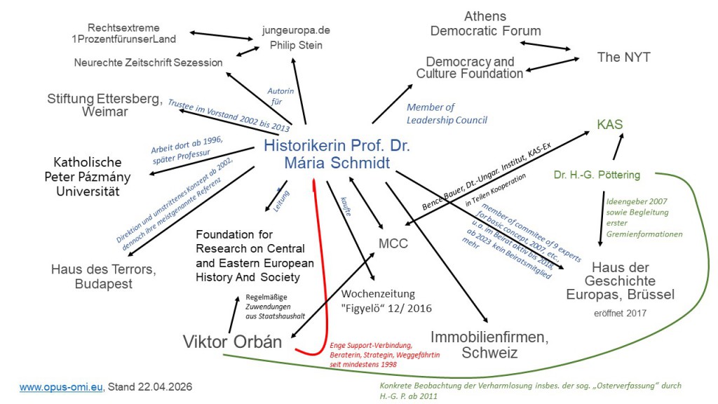 Die Historikerin nun, die bereits während seiner ersten Regierungsperiode von 1998-2002 Orbáns Chefberaterin war, agierte bis heute stets geschickt mit „Scharnierfunktion“ zwischen Positionen „illiberaler Demokratie“ und Flirts mit dem Rechtsextremismus; sie war und ist bekannt auf internationalem Wissenschaftsparkett, erhielt Funktionen in Gremien renommierter Initiativen, die sich eigentlich für Europa, gegen Diktaturen und für Demokratie einsetzen, aber agierte eben auch als Autorin für klar rechtsextreme Akteure wie z.B. Philip Stein von der Bewegung „1% für unser Land“ und dessen Portal jungeuropa. https://www.jungeuropa.de/autoren/maria-schmidt/